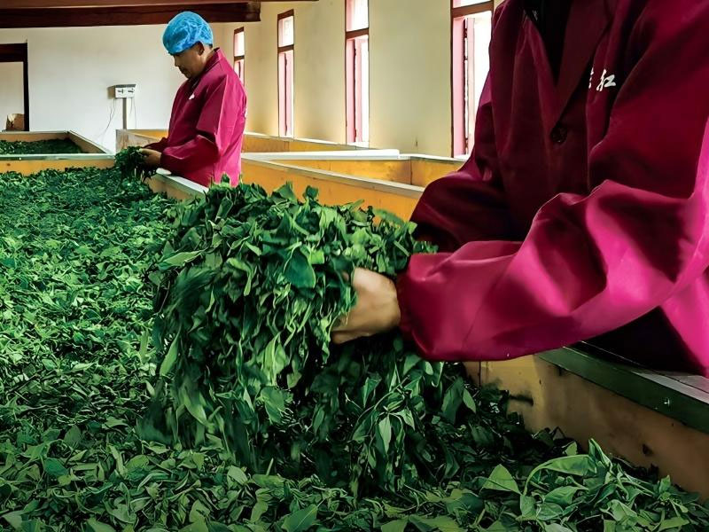 Свежесобранные листья → завяливание (умеренное завяливание повышает активность полифенолоксидазы) → скручивание (разрушение клеточной структуры листа, формирование внешнего вида, содействие полимеризации веществ внутри листа и их координации), рассыпка комков → ферментация (ключевой этап для красного чая, при котором происходят ферментативное окисление и полимеризация) → сушка (окончательная формовка и фиксация аромата). Пять этапов полной ферментации.