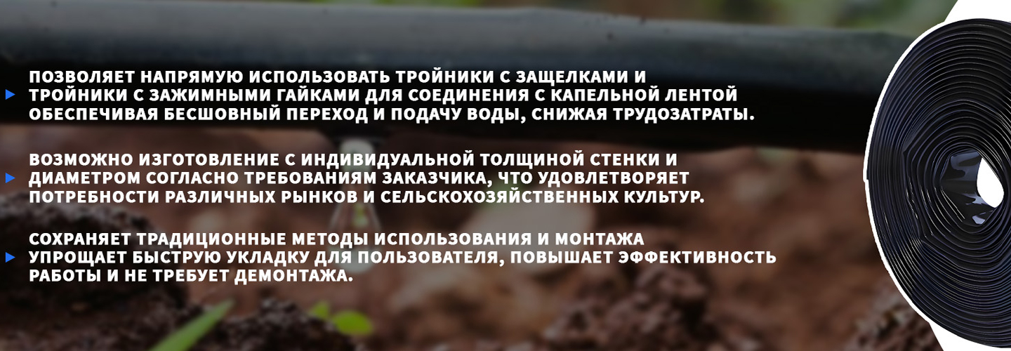 • Основная продукция: капельную ленту с внутренними вставками, мягкие PE водяные ленты для воды и PE-трубы
