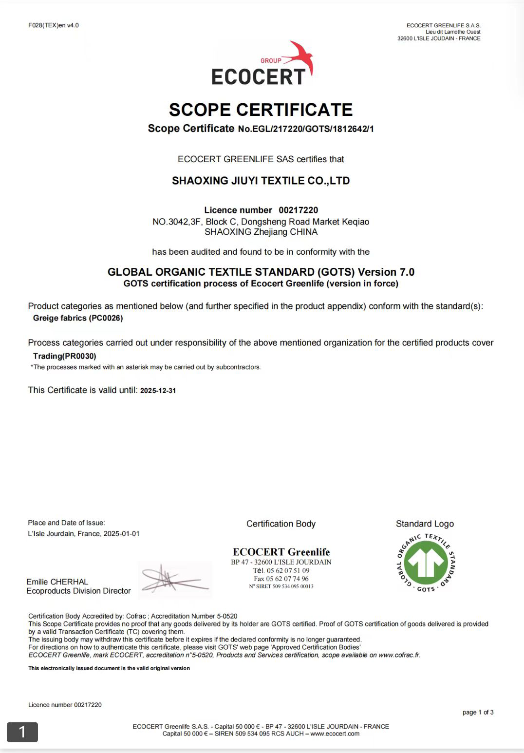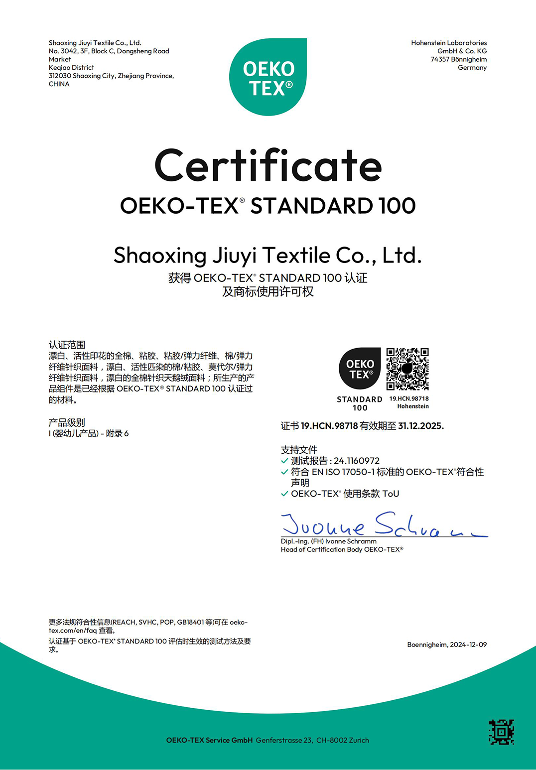 Компания располагает более чем 100 кругловязальными машинами, складом площадью 8000 квадратных метров и более чем 20 000 рулонов ткани в наличии. У нас есть все необходимые сертификаты, включая глобальный сертификат органического текстиля GOTS, немецкий OEKO-TEX от института Hohenstein, GRS и другие. Нам принадлежит более 100 патентов на полезные модели и авторских прав на произведения. Мы специализируемся на производстве трикотажных тканей, таких как одинарное джерси, интерлок, переносные резинки, жаккардовый воздушный слой, охлаждающие ткани для матрасов, молочный шелк, махровые ткани и другие, включая гребенной хлопок, органический хлопок, цветной хлопок, мягкий хлопок, бамбуковое волокно, лиоцелл, модал, полиэстер-спандекс и другие материалы. Наша продукция соответствует классу A для матерей и детей (поддерживает стандарт oeko). Мы предлагаем оптовую продажу большого количества тканей в наличии, а также поддерживаем индивидуальное вязание, крашение и печать.