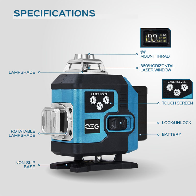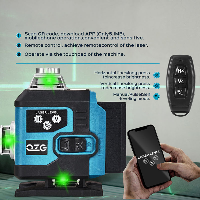 Он оснащен сенсорным экраном и горизонтальными (H) и вертикальными (V) логотипами на корпусе. Поставляется с монтажной резьбой 1/4" для легкой установки на штатив. Уровень на картинке установлен на сине-черный штатив. Это практичный инструмент в области отделки зданий и плотницких работ. Он может излучать зеленую лазерную линию, горизонтальные и вертикальные линии просты в управлении, яркость можно регулировать длительным нажатием, и он имеет ручной/импульсный автоматический режим нивелирования. Поддерживает управление через приложение (всего 5,1 МБ, отсканируйте QR-код для загрузки), дистанционное управление и управление с помощью сенсорной панели корпуса.