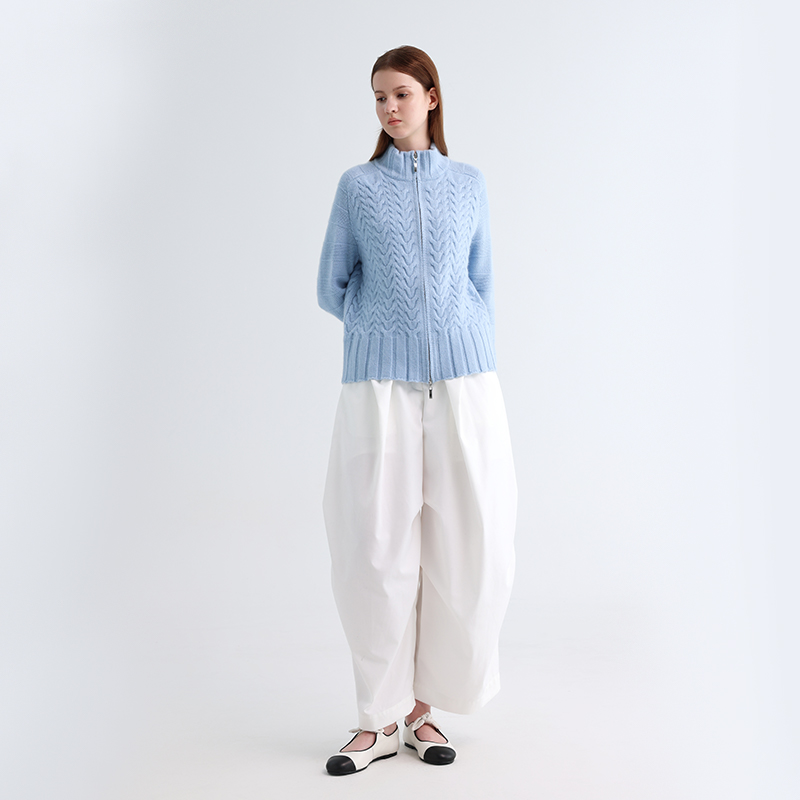 Этот свитер из чистого кашемира одновременно модный и теплый. Воротник-стойка на молнии практичен и практичен. Молнию можно свободно регулировать, что удобно при надевании и расстегивании, а также регулировать уровень тепла по мере необходимости. Многослойный узор переплетения добавляет изысканности и объемности общему образу, демонстрируя уникальную эстетику ручной работы и разрушая монотонность однотонных свитеров.