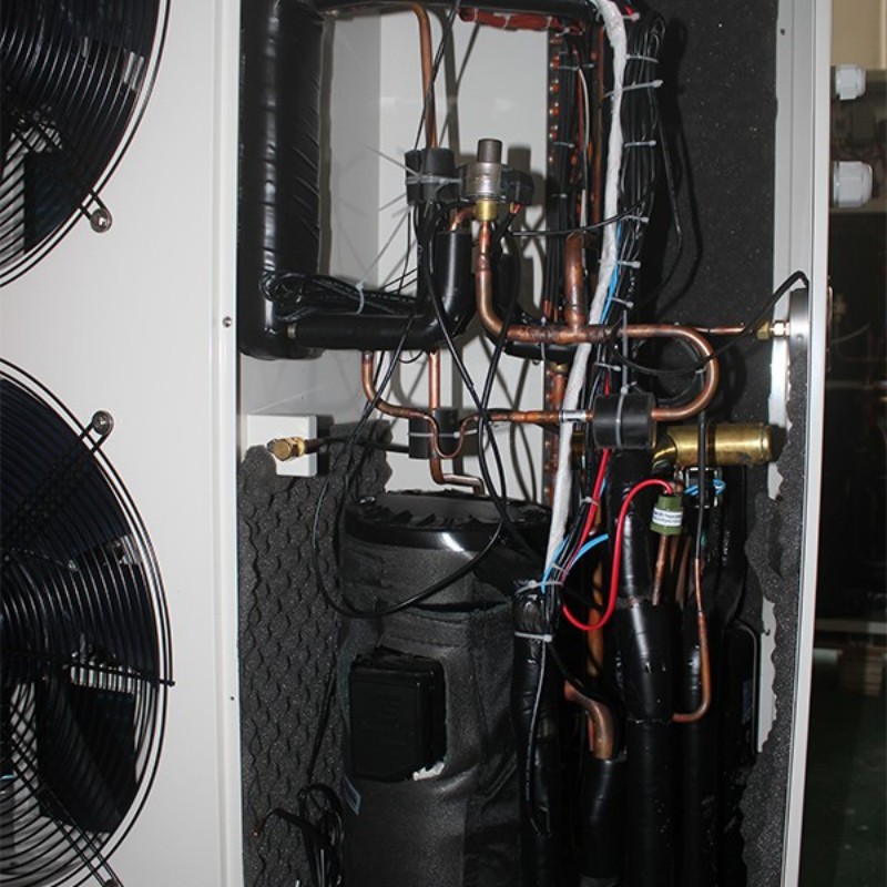 Конструкция отличается низким уровнем шума и повышенной долговечностью: полностью герметичный спиральный компрессор в сочетании с кожухом вентилятора из модифицированного полипропилена обеспечивают уровень шума при работе не более 45 дБ. Двигатель с защитой класса IPX4 и антикоррозийным покрытием адаптирован для эксплуатации в условиях повышенной влажности.