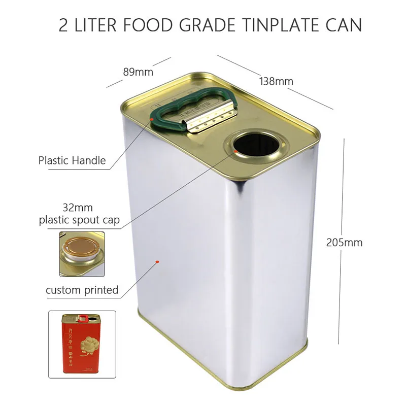 Откройте для себя наши премиальные 2-литровые квадратные пустые жестяные банки для оливкового масла из пищевого сырья. Идеально подходят для упаковки оливкового масла экстра вирджин, наши металлические банки прочные, настраиваемые и безопасные для пищевых продуктов. Заказывайте сейчас у TCE-Tin Can Expert.