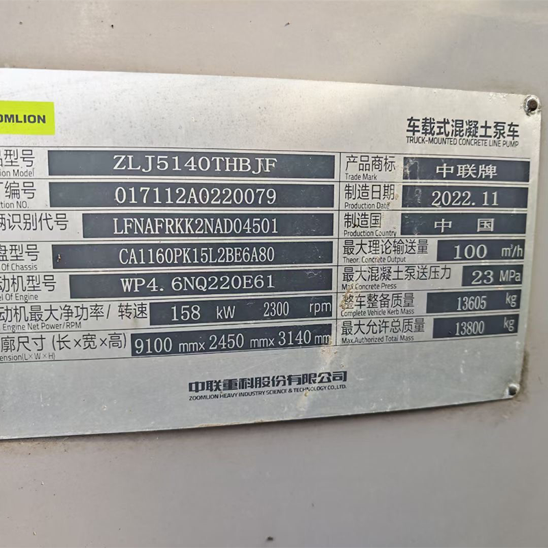 Насос Zoomlion 2023 10022 Jiefang Chassis National для шести автомобилей.Производительность может достигать 100 квадратных метров в час, а максимальное давление перекачиваемого бетона составляет 18-22 МПа.