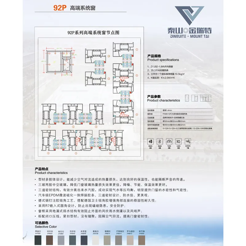 Высококлассная система одностворчатых окон премиум-сегмента. Широкая рама 92 мм и сверхширокий терморазрыв 35.3 мм формируют усиленный термический барьер. Вес профиля достигает 10.5 кг/м², обеспечивая исключительную структурную прочность. Измеренный коэффициент теплопередачи K ≤ 2.0 Вт/м²·K, что приближается к стандартам пассивного дома. Совместима с трёхкамерными стеклопакетами (5+12А+5+12А+5) или усиленными двухкамерными вариантами (5+20А+5), что позволяет использовать окна в экстремальных климатических условиях. Включает все премиальные особенности: многокамерную конструкцию, трёхконтурное уплотнение, автомобильные уплотнители, немецкую технологию герметизации анкерных отверстий, закругления R7 для безопасности, скрытый дренаж и закрытый штапик. Продукт предназначен для пользователей, ценящих энергоэффективность, акустический комфорт и высочайшее качество жизни.