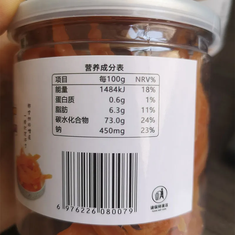 Сладкий картофель — традиционный деликатес провинции Гуйчжоу, любимый потребителями за свою естественную мягкость и сладковатую текстуру. Обычно его готовят на пару целиком, очищают, затем нарезают и сушат на воздухе. Сладкий картофель, продающийся ломтиками или полосками, обладает съедобными и лечебными свойствами, включая стимулирование ци и слюноотделение, и признан Организацией Объединенных Наций одним из самых полезных продуктов. Белый иней — это сахар, естественным образом выделяемый из сушеного сладкого картофеля, поэтому употребляйте его с уверенностью. Сладкий картофель, продающийся полосками или кусочками, имеет оранжево-красный цвет и сладкий вкус, что делает его полезным перекусом.