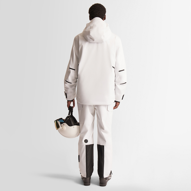 Это мужской лыжный костюм белого цвета, чистая как снег, демонстрирует моду и жизненную силу. Продуманное сочетание черных вспомогательных материалов создает резкий цветовой контраст, добавляя к общему ощущению иерархии и моды.