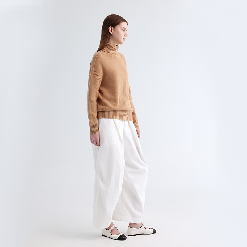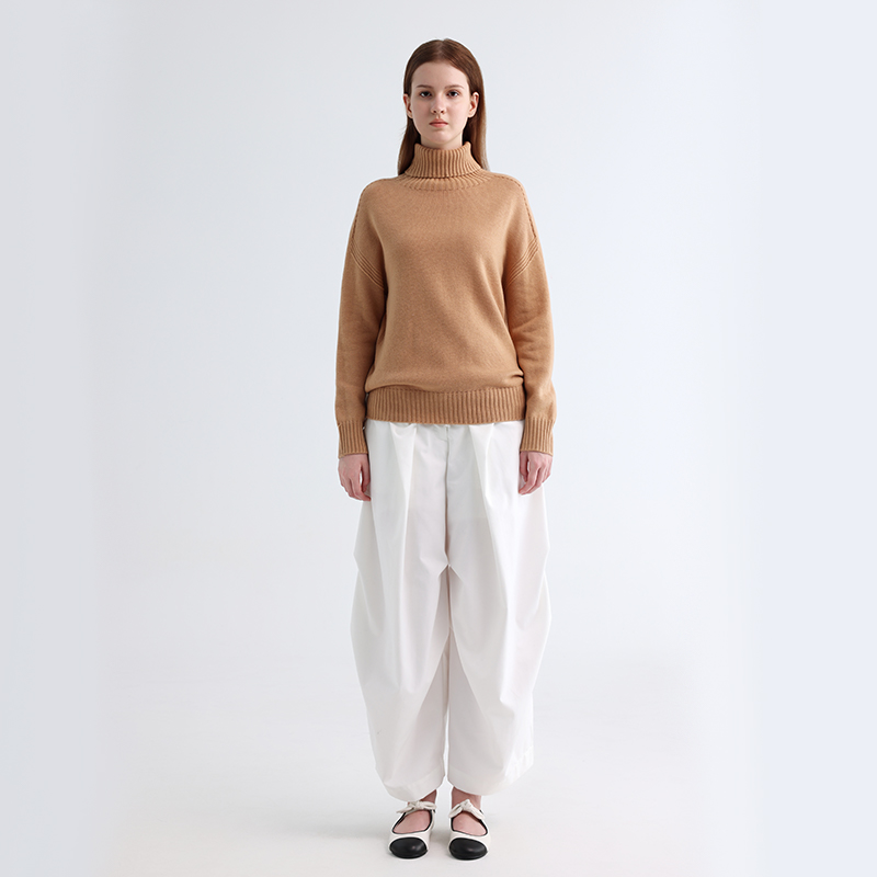 Общий цвет «верблюжий» — классический и универсальный, излучающий спокойствие и тепло земли. В сочетании с простыми белыми широкими брюками он создаёт резкий цветовой контраст, который не только подчёркивает фактуру свитера, но и демонстрирует простой и атмосферный стиль. В этом свитере вы будете чувствовать себя комфортно и стильно в холодное время года, будь то прогулка по улице или тихая тишина дома.