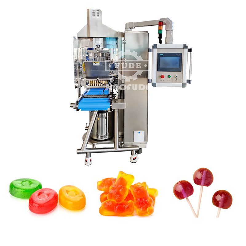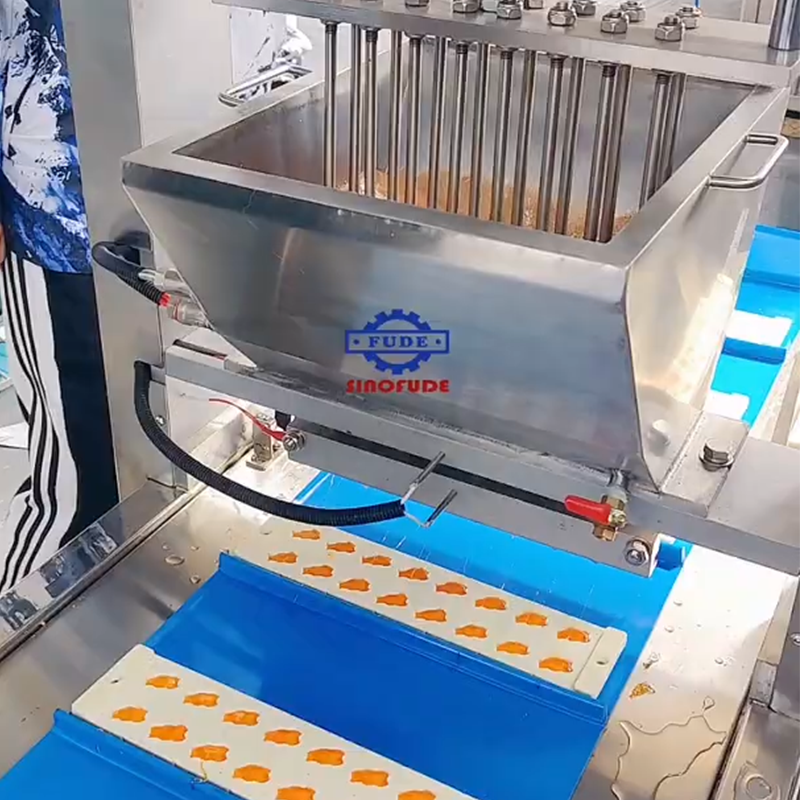 Заливочная система с сервоприводом может производить одноцветные/двухцветные/наполненные конфеты, а форму можно заменить для изготовления твердых леденцов. Он имеет 4-метровый охлаждающий конвейер, что является лучшим выбором для небольшого начинающего бизнеса.