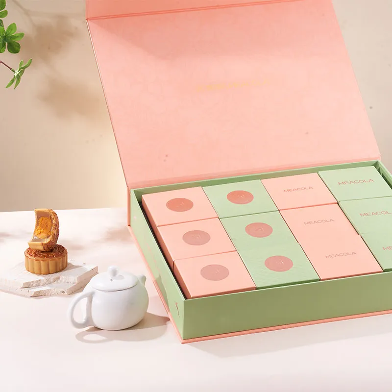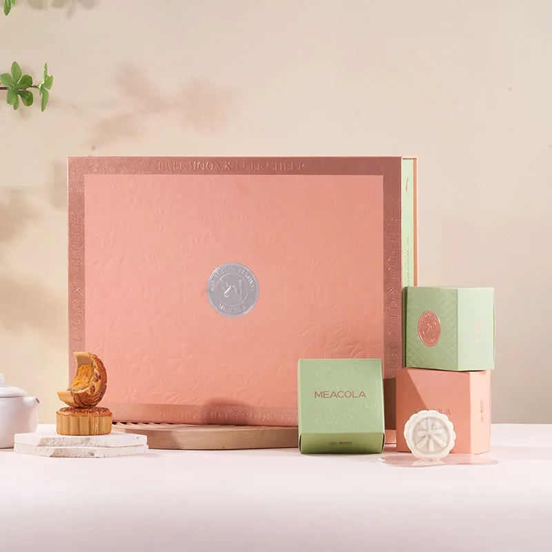 Эта подарочная коробка выполнена в форме книги. Тема «Цветочная полнолуние» легла в основу дизайна. Нежно-розовая коробка украшена объёмным тиснёным цветочным узором, создающим нежную и яркую текстуру. Серебряная эмблема в центре коробки добавляет нотку роскоши. Зелёная полоса сбоку украшена надписью «Полная луна», отсылающей к образу полной луны во время Праздника середины осени. Общий дизайн сочетает нежную красоту цветов с полнотой луны, а детали передают тепло праздничного сезона, делая коробку идеальным воплощением элегантности и душевности.
