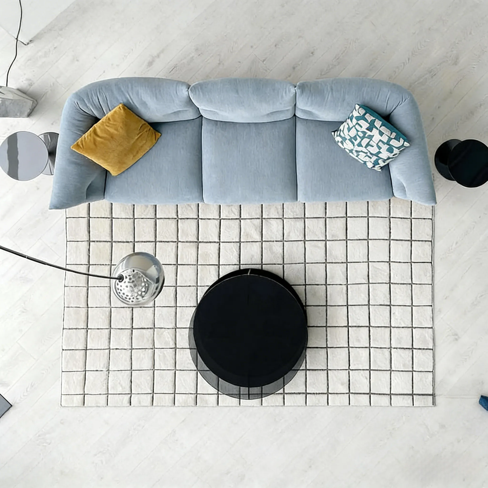 Диван Moncloud, представленный в нашем выставочном зале в рамках выставки Предложение Экспо, имеет черную основу и обивку из ткани голубого цвета. В комплект входят 2 тканевые подушки (55x55 см), одна желтая и одна с темно-бирюзовым и белым узором (задняя часть темно-бирюзового цвета).