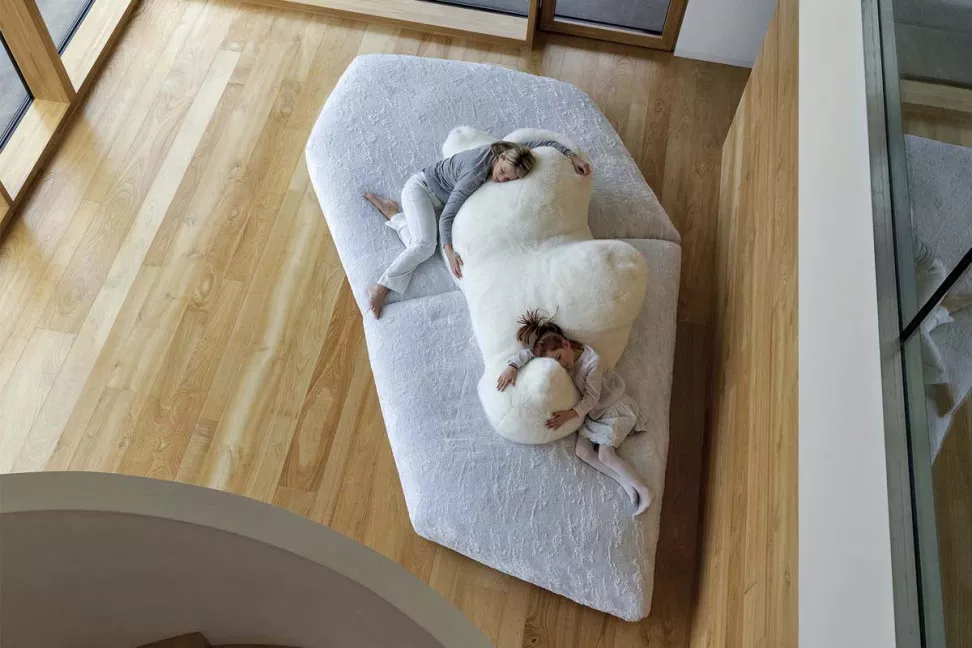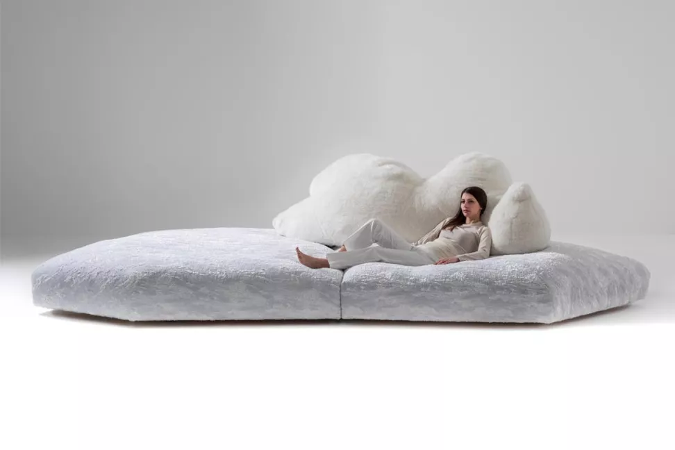 Это действительно экстравагантная и удивительная работа, известная своим оригинальным и смелым дизайном. Диван Pack создан по мотивам ледяного тороса, напоминающего сюрреалистический полярный пейзаж. В центре этой необычной композиции лежит на боку большой белый медведь, служащий уютной спинкой и выразительным элементом дизайна. Основание дивана Pack представляет собой детализированное изображение ледяного тороса, покрытого тканью, созданной специально для этого дивана, с текстурой, напоминающей слои льда и создающей уникальные тактильные ощущения.