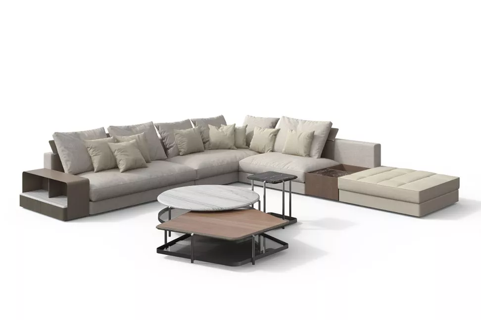 Диван Skyline можно дополнить такими аксессуарами, как журнальные столики, пуфы и декоративные подушки, чтобы удовлетворить все практические и эстетические потребности. Пуф, также доступный с асимметричным стеганым узором, добавляет системе дополнительный элемент комфорта и стиля. Журнальный столик Skyline доступен в двух вариантах. Угловые журнальные столики изготовлены с каркасом и столешницей из ясеня или мрамора. Также можно добавить элемент с ящиком из ясеня и съемным подносом, с мраморной или металлической столешницей с отделкой пелтрокс и раковиной из закаленного стекла серого или бронзового цвета. Журнальные столики из ясеня с боковыми полками отличаются элегантным и практичным дизайном. Верхняя поверхность доступна в различных вариантах, включая мрамор, металл с отделкой пелтрокс или кожу. Также можно добавить раковину из закаленного стекла серого или бронзового цвета.