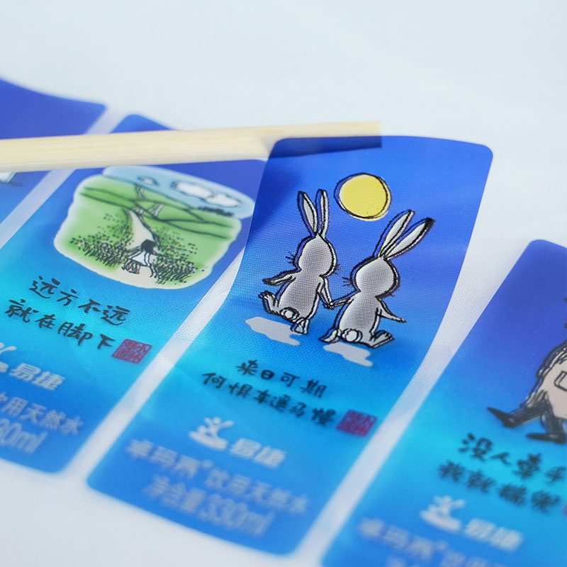 Процесс двусторонней печати с полным поворотом применяется для достижения высокой четкости печати с обеих сторон, а сложные изогнутые поверхности можно ламинировать без давления. Двустороннее отображение информации о бренде, инструкций или многоязычной информации экономит место и повышает практичность. Он особенно подходит для этикеток минеральной воды и пива, а также для дизайна вращающейся упаковки. Двусторонняя прозрачность БОПП-пленки позволяет прекрасно продемонстрировать содержимое бутылки после маркировки. Он прозрачен и не имеет белых краев.