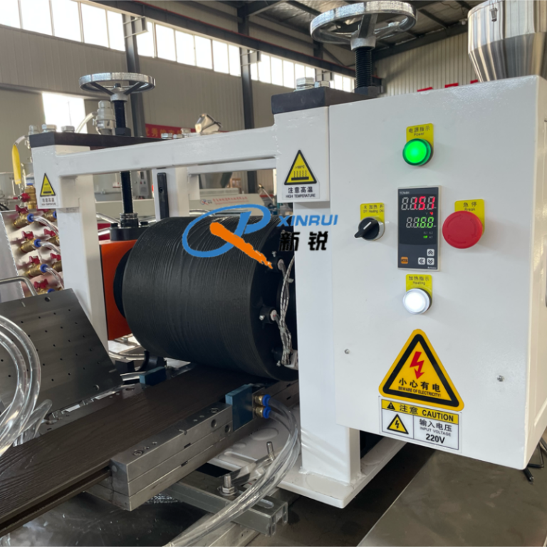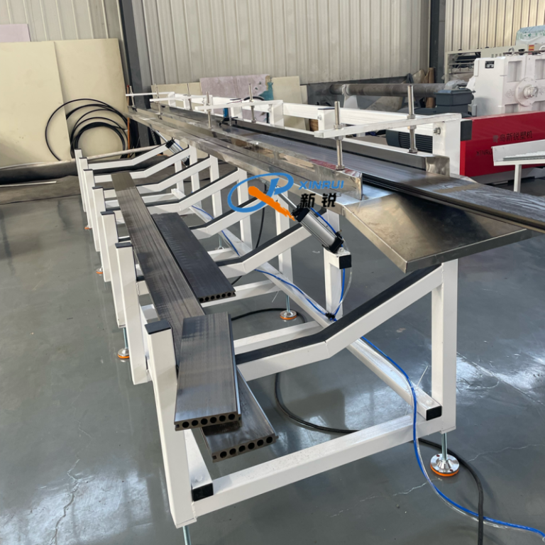--Машина для изготовления полов из ДПК в основном состоит из шнекового питателя, конического двухшнекового экструдера, пресс-форм, вакуумного установочного стола, станка для резки, штабелера.
