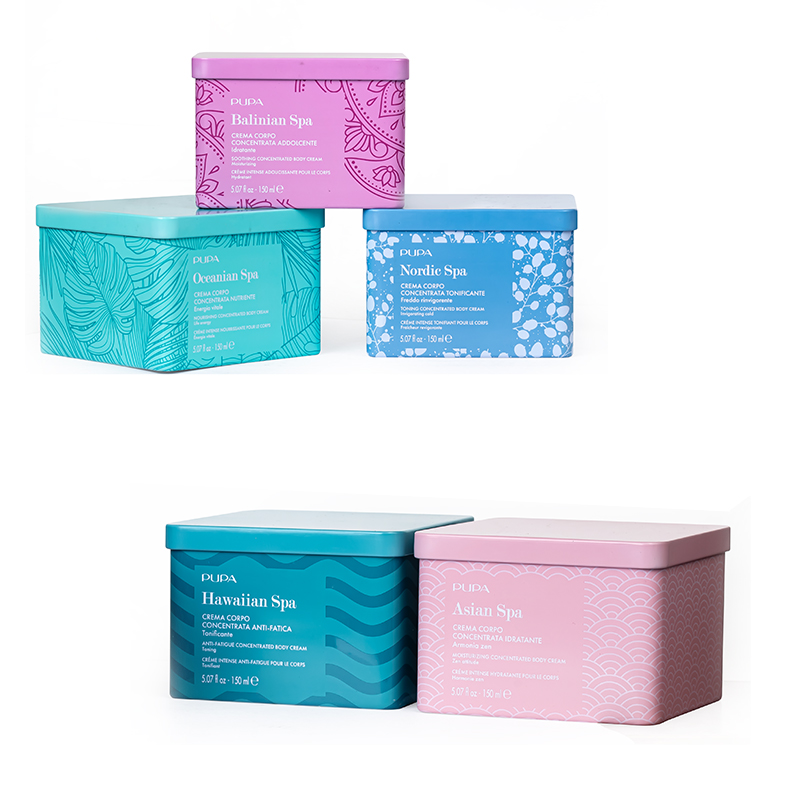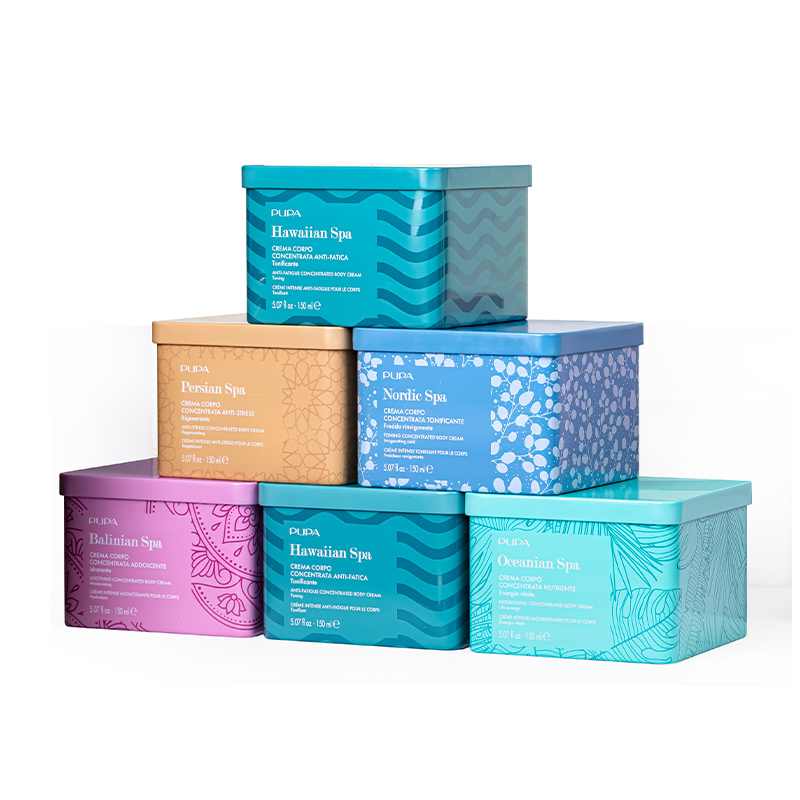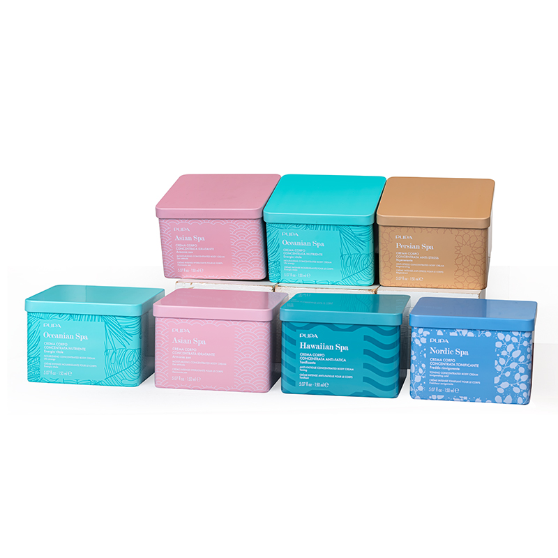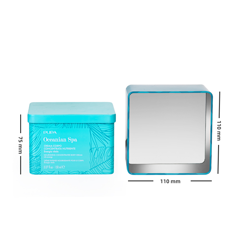 ◆ Печать: 4C (CMYK) офсетная печать, один цвет Pantone, белый лак и глянцевое покрытие для внешней стороны крышки; 4C (CMYK) офсетная печать, цвет Pantone и белый лак для внешней стороны корпуса; Серебряный лак для внешней стороны дна и внутренней части жестяной коробки.