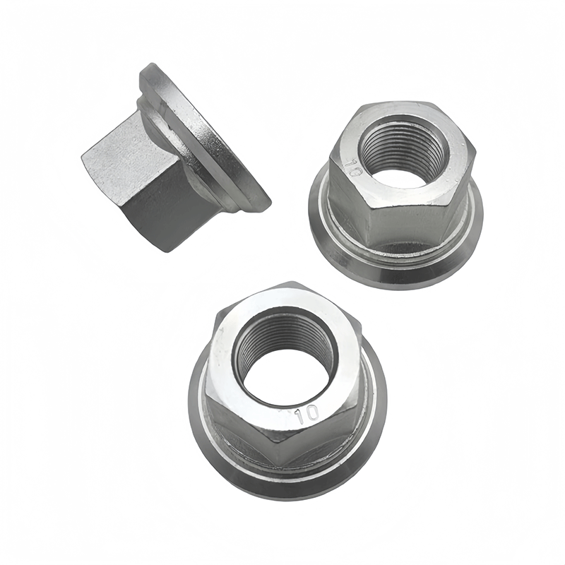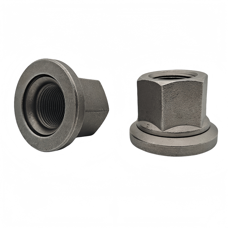 Гайка строго соответствует стандарту ISO 2320 для стопорных гаек и имеет уникальную коническую посадку (угол 60°), обеспечивающую идеальное прилегание к колесному диску и равномерное распределение усилия затяжки. Специальная фланцевая поверхность с противоскользящими насечками эффективно предотвращает ослабление гайки, сохраняя надежное крепление даже в условиях сильной вибрации. Внутренняя резьба класса точности 6H, обработанная методом точной накатки, имеет высокую чистоту поверхности, что гарантирует идеальное сопряжение с колесными болтами.