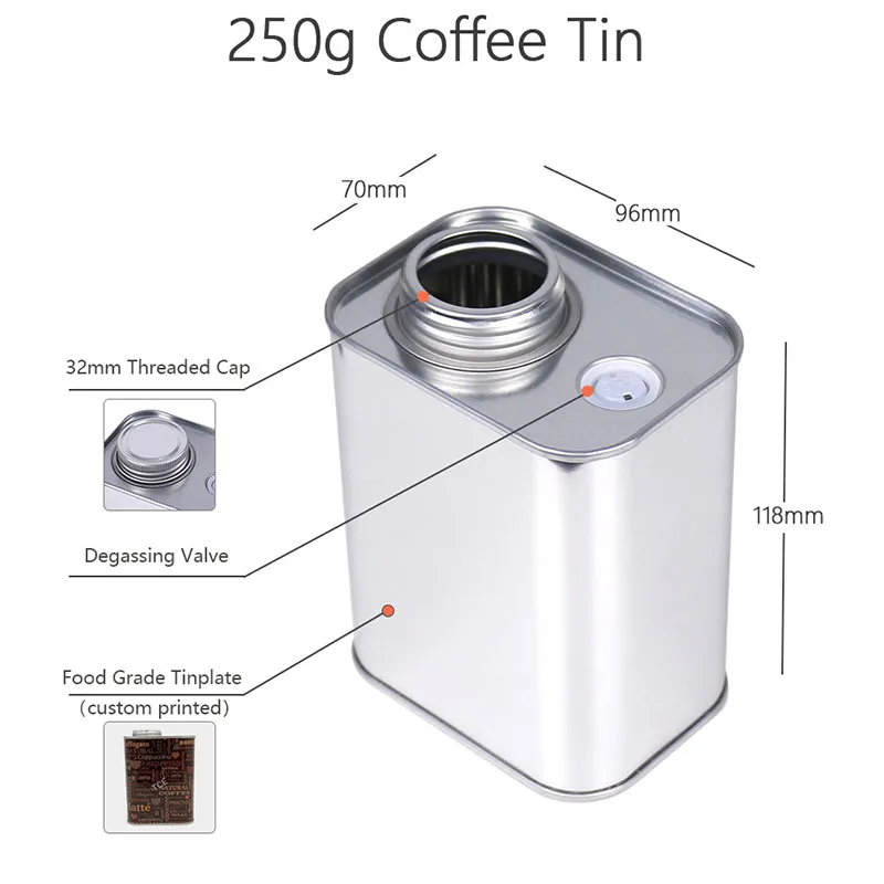 Изучите нашу жестяную банку для кофе 250г, предназначенную для упаковки кофейных зерен с герметичным уплотнением и дегазационным клапаном. Индивидуализация размера, цвета и параметров печати. Идеально подходит для сохранения свежести кофе и доступна по оптовым ценам с быстрой доставкой.