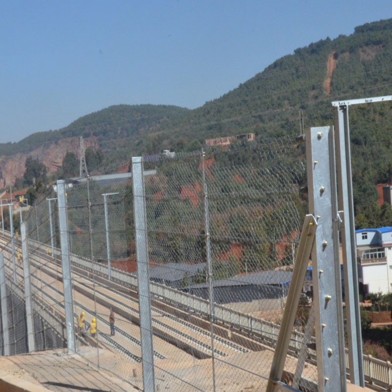 Гибкая сетка гриль в основном состоит из фундамента, стальных колонн (включая концевые стальные колонны и средние стальные колонны), стального каната, сетки гриль и устройства рассеивания энергии.