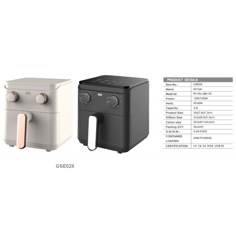 GSE028 - это фритюрница с ручным управлением объемом 4 л, созданная для простоты, эффективности и адаптации к требованиям OEM-производителей. Работает при мощности 1300 Вт и напряжении 120 В. Прочные материалы PP+PA+ABS+PC и элегантные ручки управления обеспечивают интуитивное использование и длительную работу.