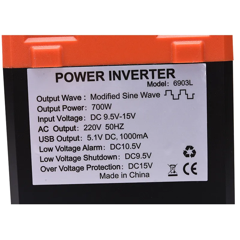 Инвертор с модифицированной синусоидой 6903L имеет номинальную мощность 700 Вт, пиковую мощность 1400 Вт, выходное напряжение 230 В и поддерживает регулируемую выходную частоту 50 Гц/60 Гц. В этом устройстве используется технология коммутации положительной и отрицательной полярности источника постоянного тока для генерации модифицированной синусоидальной волны, близкой к прямоугольной. Он подходит для использования в обычных резистивных электроприборах, таких как осветительные приборы, телевизоры, компьютеры и рисоварки. Для питания прецизионных приборов рекомендуется инвертор с чистой синусоидой.