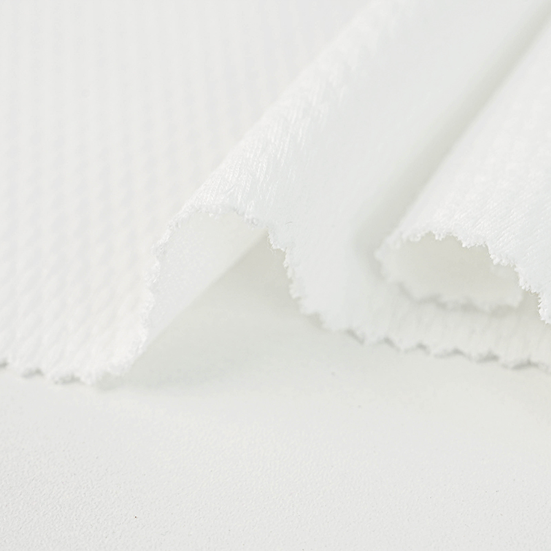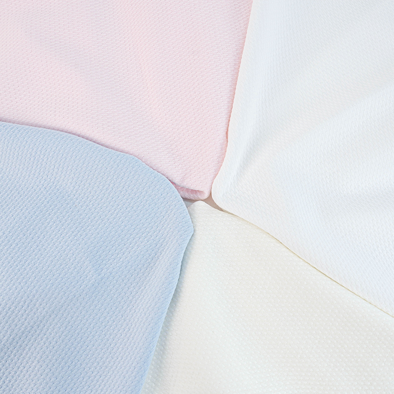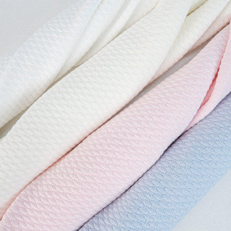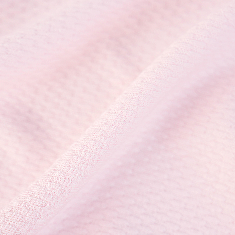 Это простая жаккардовая ткань с пузырьковой сеткой шириной 185 см и весом 240 г/м2. Характеристики процесса: 95% расчесанный хлопок + 5% спандекс, сотканная на жаккардовой машине для создания трехмерной текстуры пузырьковой сетки и формирования структуры микровоздушного слоя. Эта ткань эластична и подходит для многосуставной деятельности ребенка. Уникальная структура пузырьковой сетки может уменьшить площадь контакта с кожей на 40%, и она не липкая при ношении летом. Рекомендуемые области применения включают спальные мешки для новорожденных, одежду для ползания и комбинезоны для защиты живота, особенно для детей с потливым телом.
