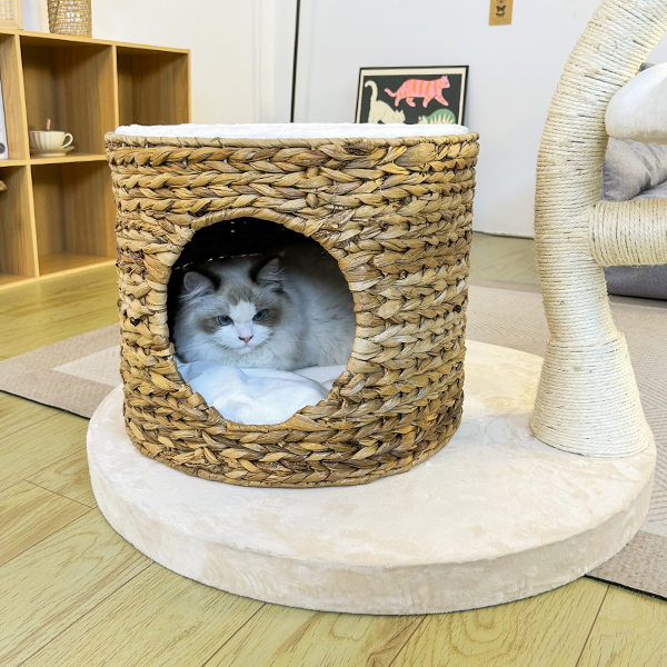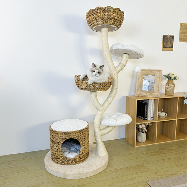 Волнистая форма, которую вы видите, — это корзина, сплетенная вручную из натурального материала — банановых листьев. В конструкции используется металлический каркас. После формовки его обрабатывают для предотвращения ржавчины, а затем ткут из банановых листьев. Наши банановые листья обработаны средствами против плесени и насекомых, поэтому вы можете использовать их с уверенностью и безопасностью. Форма белого цветка сделана из дерева, плюшевой ткани, а затем из кукольного хлопка, а затем сшита в виде сетчатого цветка. Этот эффект может заставить вашего котенка чувствовать больше прикосновений и безопасности, когда он наступает на него или спит на нем! Справа внизу также находится рамка, сплетенная из банановых листьев. Столбы изготовлены из высококачественных стальных труб, полученных методом гидродинамической прокатки, которые изгибаются, формуются, свариваются и, наконец, покрываются порошковым напылением при температуре 300 градусов. Вы можете видеть, что белая часть столба оплетена слоем чистого натурального материала — пеньковой веревки.
