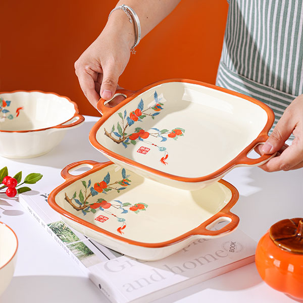 Эта посуда с тематикой каки сочетает в себе восточное искусство ручной росписи и дизайн — раскидистые ветви и сочные красные каки символизируют «удачу во всех делах» и передают добрые пожелания. Молочно-белая глазурь в сочетании с теплым оранжевым кантом выглядит свежо и фактурно, подходит для сервировки русских блюд: будь то насыщенный борщ, обильное жаркое или изысканные холодные закуски, посуда и блюда дополняют друг друга, придавая русскому столу уникальный восточный колорит.