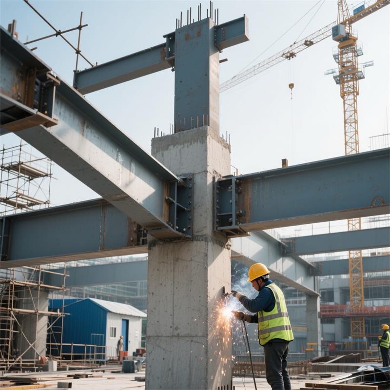 Композитные балки используют стальные балки из стали Q355B для восприятия растягивающих усилий и бетонные плиты перекрытия класса C30 и выше для восприятия сжимающих усилий, передача сдвигающих усилий осуществляется с помощью шпилек, пролеты превышают 30 метров, несущая способность при изгибе на 40-60 процентов выше, чем у стальных балок. Композитные колонны используют стальные трубы из стали Q235B для ограничения бетона, прочность на сжатие увеличивается в 3-4 раза, коэффициент осевого сжатия составляет 0,8-1,0.
