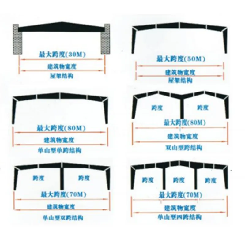 Большепролетные легкие стальные портальные конструкции в зависимости от функционального назначения могут выполняться в различных структурных формах: односкатные однопролетные, двускатные однопролетные, однопролетные с несколькими стойками, а также многопролетные многоскатные. Балочные и стоечные элементы изготавливаются из сварных H-образных стальных профилей постоянного или переменного сечения.