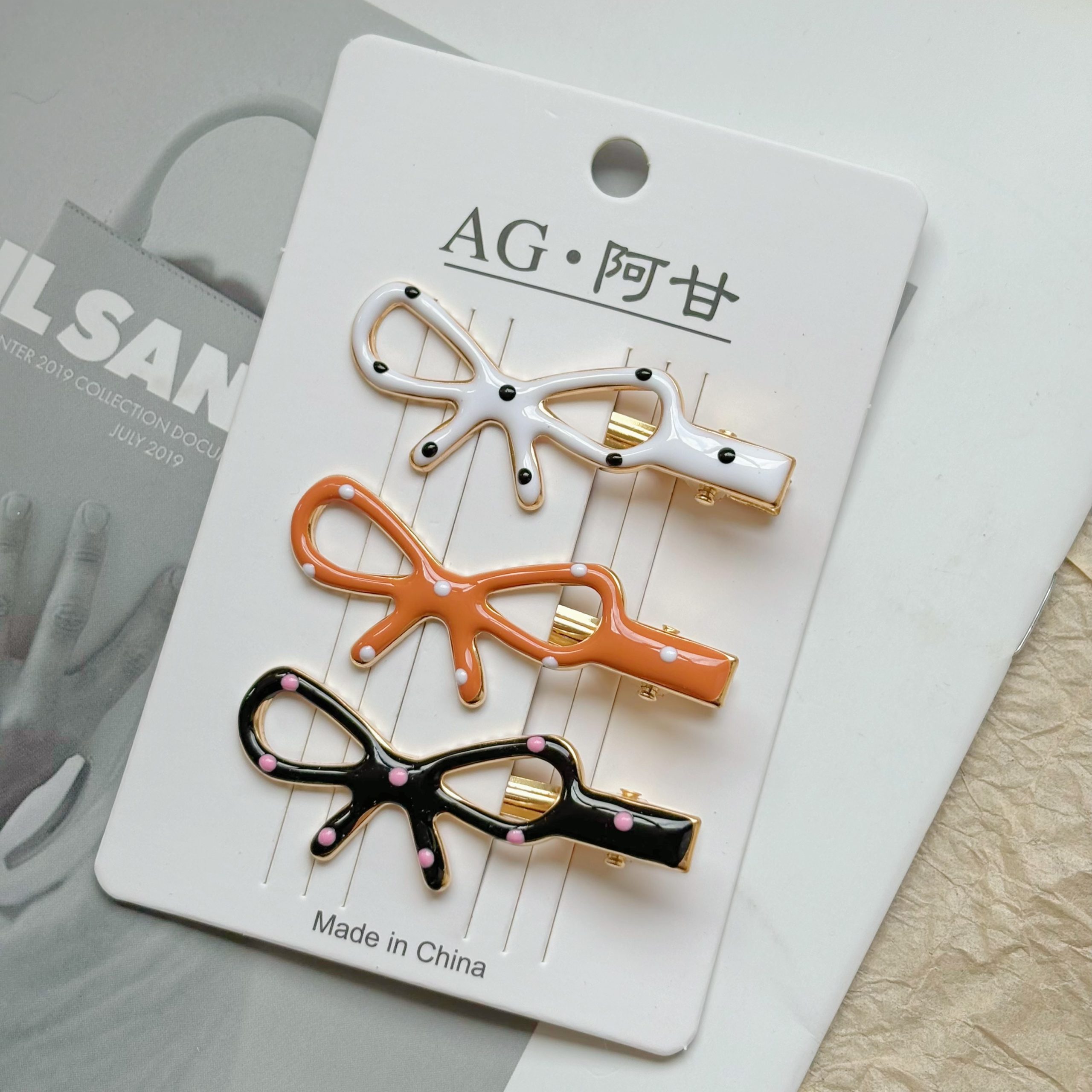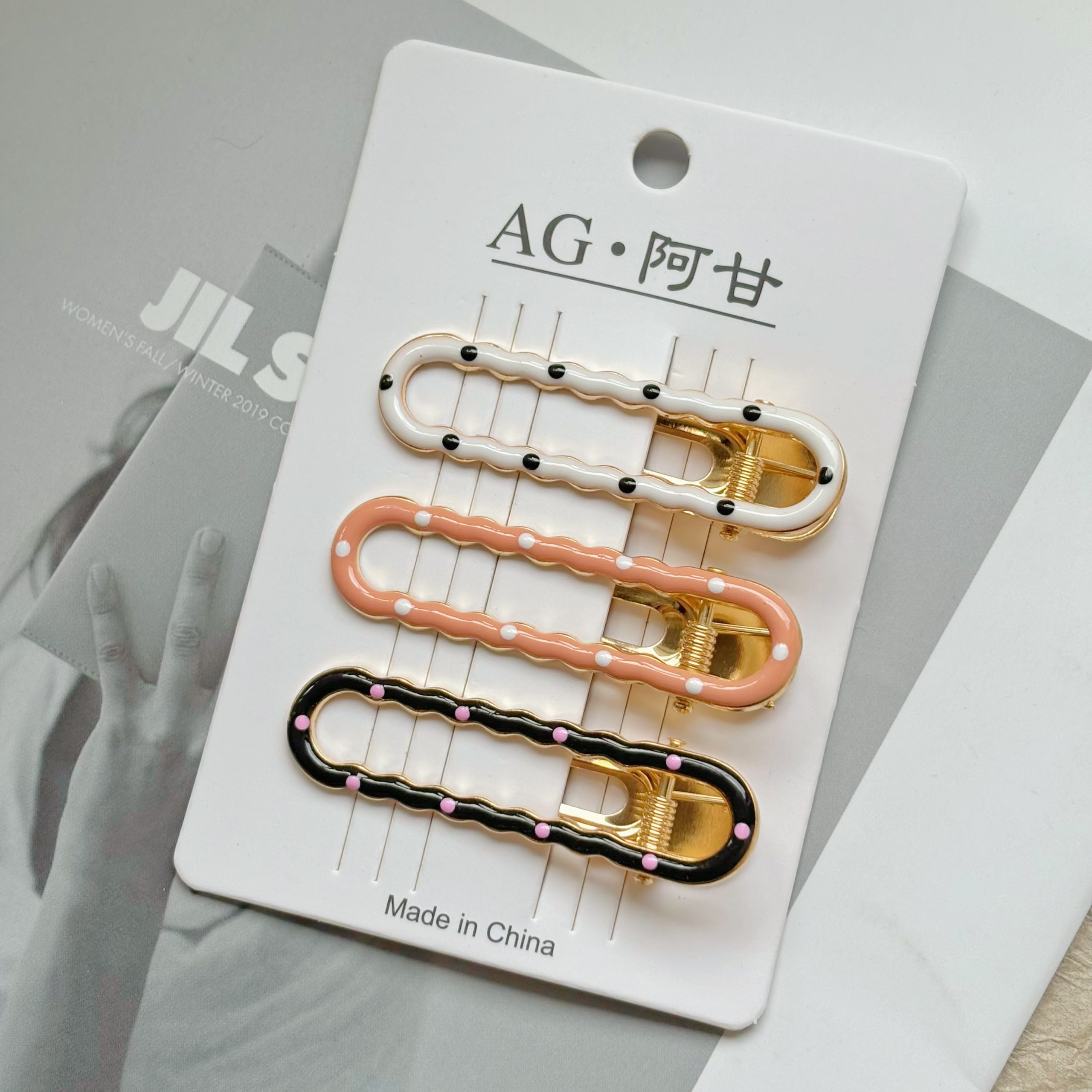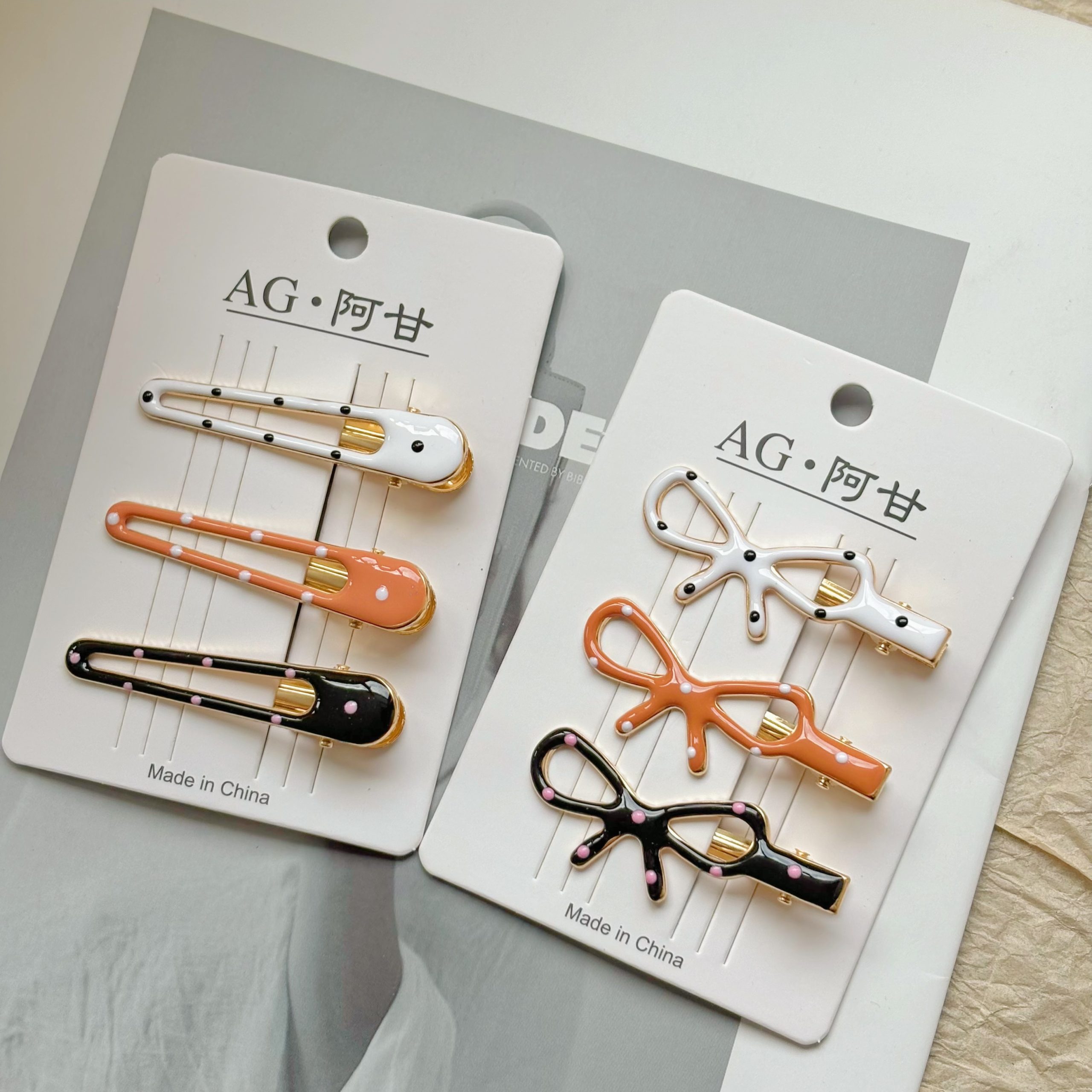 Дизайн: В ассортименте представлены как лаконичные удлинённые модели, так и милые заколки с бантами, удовлетворяющие различные стилевые предпочтения. Техника капельного нанесения точечного узора делает заколки особенно привлекательными: изысканное сочетание цвета слоновой кости с аккуратными чёрными точками подчёркивает элегантность; нежный розовый с игривыми белыми точками излучает девичье очарование; классический чёрный с нежно-розовыми точками добавляет современности и индивидуальности. Каждая цветовая комбинация продумана до мелочей, словно тщательно созданное произведение искусства.