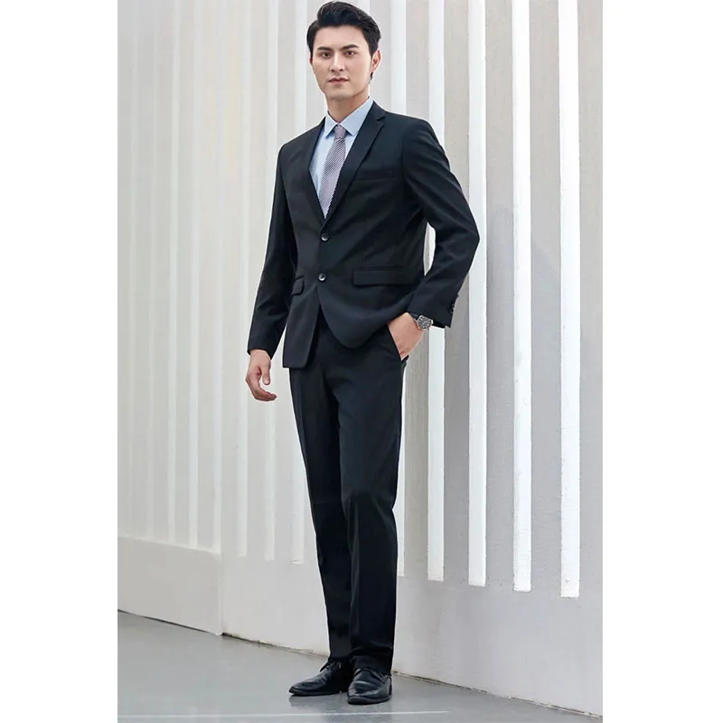 Покрой – душа этого костюма. Мужская версия имеет однобортный двубортный дизайн с заостренными лацканами, четкими линиями, приталенной талией и естественной отделкой плеч, демонстрируя достойный и элегантный вид. Женская версия еще более изысканна, идеально подчеркивая женскую фигуру благодаря однобортной застежке на три пуговицы, узкому лацкану и четко очерченной талии. Ее облегающий, но не стесняющий движений силуэт одновременно утонченный и стильный. Брюки как мужской, так и женской версии имеют узкий прямой крой с четкими линиями и правильной длиной, подчеркивая эргономичную конструкцию костюма.