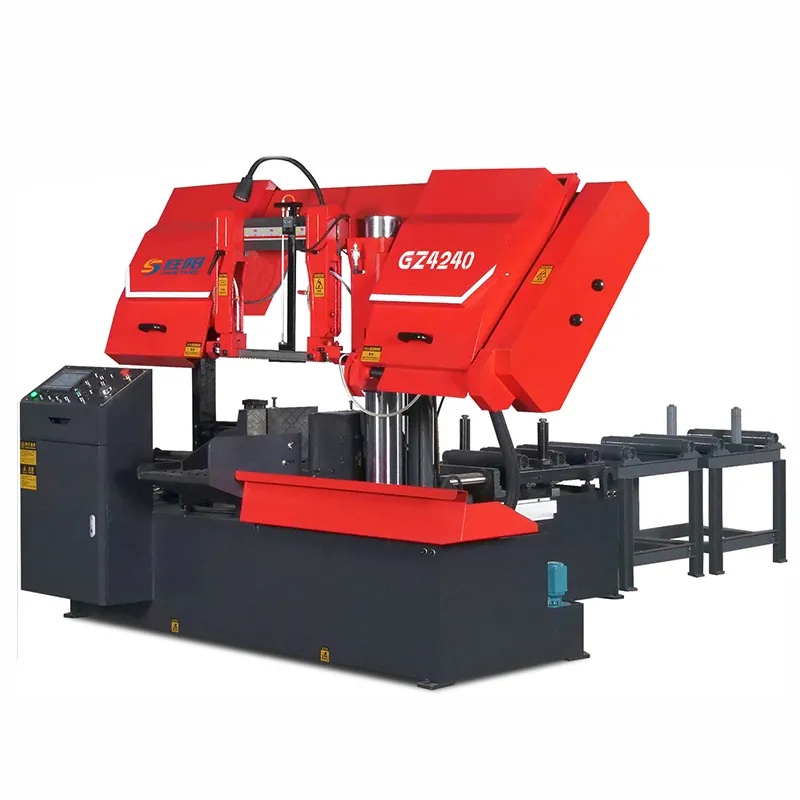 Ленточнопильный станок с ЧПУ модели GZ4240 выполнен в цельном колонном горизонтальном конструктивном исполнении. В основе лежит Т-образное основание, в центральной части которого установлена гидравлическая система зажима и подачи; вся пильная рама (лук) установлена через основную и вспомогательную стойки на задней половине основания, а подъемный гидроцилиндр обеспечивает вертикальное перемещение пильной рамы и ее рабочую подачу; главный приводной механизм справа от пильной рамы приводит во вращение ведущее колесо, слева натяжное устройство натягивает ведомое колесо и пильную ленту, а по центру левый и правый направляющие кронштейны по обе стороны от зажимных тисков заготовки обеспечивают вертикальное направление пильной ленты вниз; управление осуществляется с помощью PLC и сенсорного экрана, подача контролируется посредством оптической линейки, точность однократной подачи может достигать ±0,2 мм.