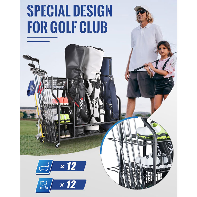 По сравнению с другими органайзерами для хранения гольф-оборудования, этот оснащен дополнительной подставкой для хранения гольф-клюшек, которая может вместить до 12 гольф-клюшек и гольф-флажков.