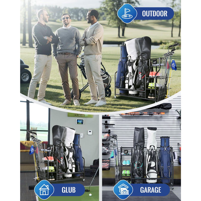Эта стойка для хранения гольф-оборудования вмещает до 3 сумок. Она оснащена 3 ярусами для обуви и 4 съемными крючками, чтобы хранить все ваше гольф-оборудование в одном месте.