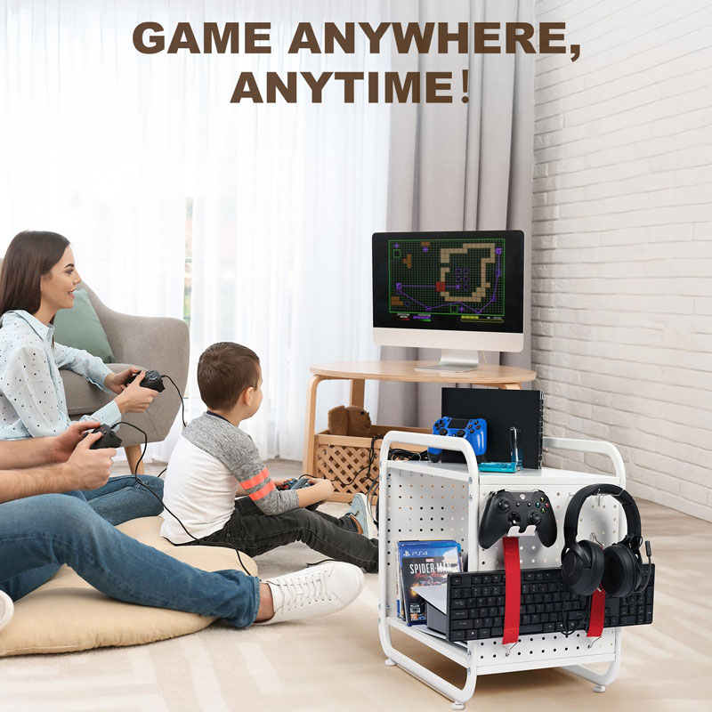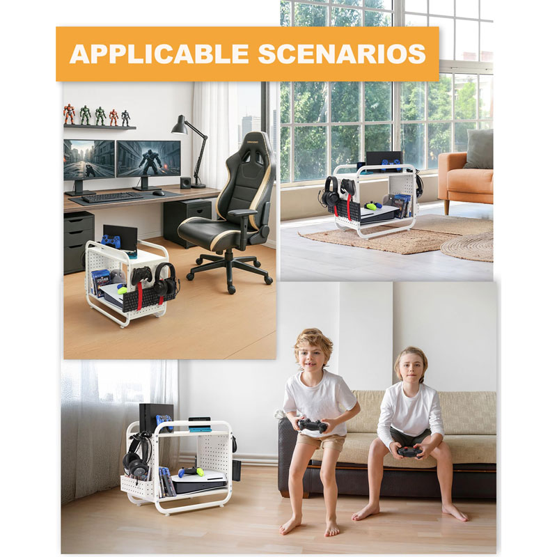Оснащенный эластичными ремнями, крючками для хранения и боковой корзиной, этот стеллаж сочетает в себе держатель для контроллеров, подставку для наушников и органайзер для игровой консоли в одном месте, что уменьшает беспорядок и позволяет быстро настроить все необходимое во время игровых сессий.