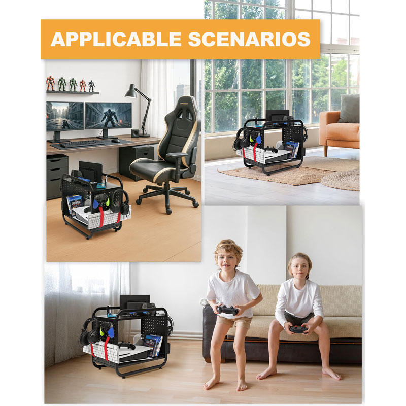 Оснащенный эластичными ремнями, крючками для хранения и боковой корзиной, этот стеллаж сочетает в себе держатель для контроллеров, подставку для наушников и органайзер для игровой консоли в одном месте, что уменьшает беспорядок и позволяет быстро настроить все необходимое во время игровых сессий.