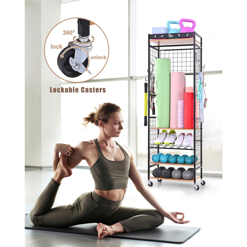 Эта тележка для хранения йоги оснащена 4 прочными колесами с поворотом на 360 градусов (2 из которых блокируются) и может легко перемещаться как в помещении, так и на улице.
