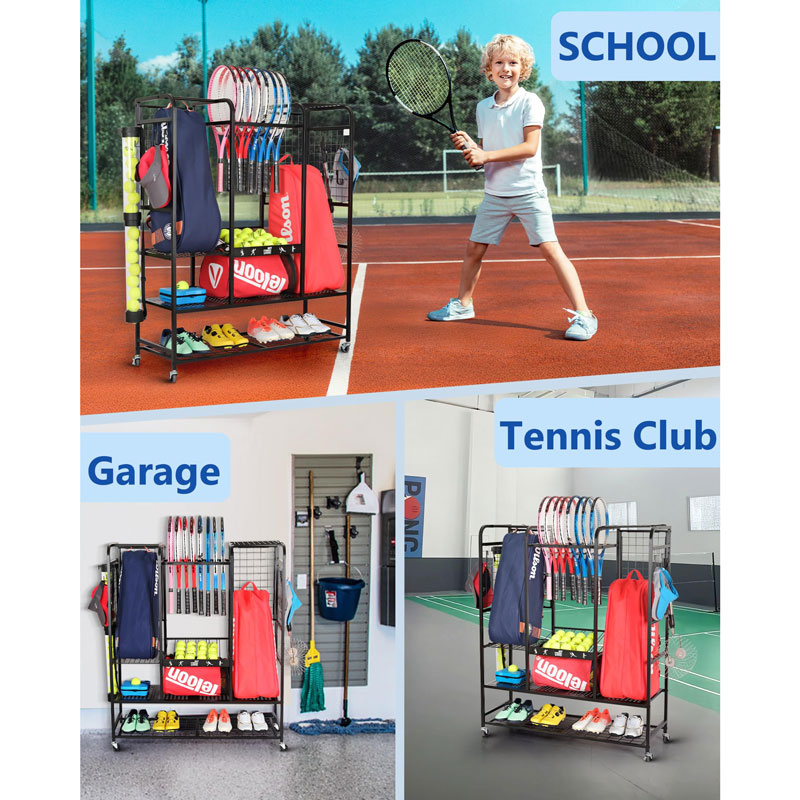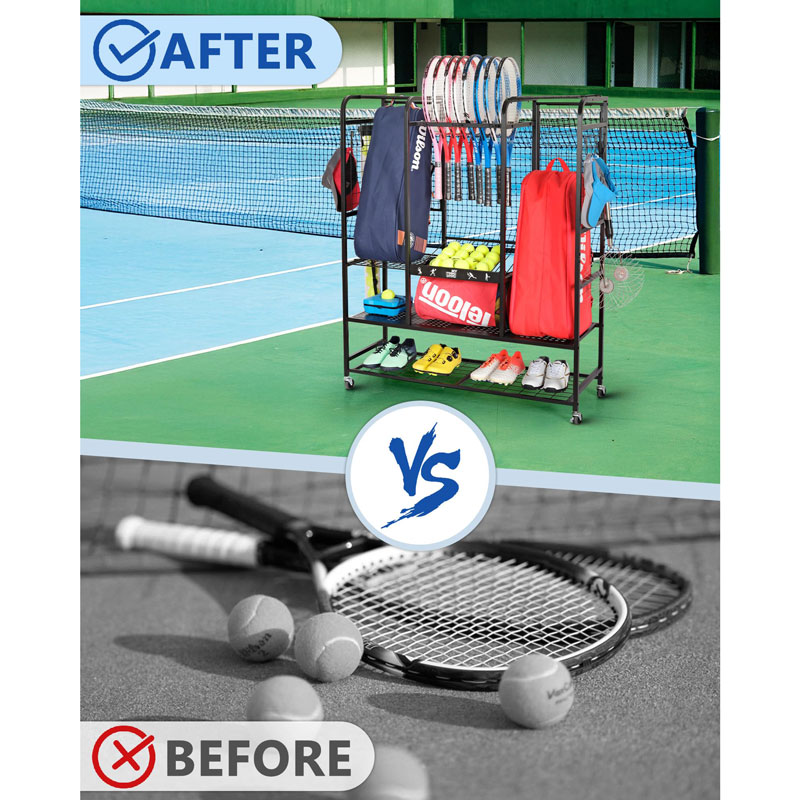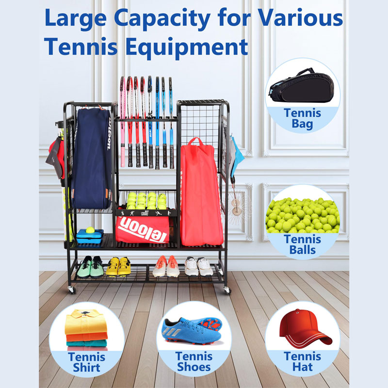 Этот органайзер для теннисного снаряжения имеет несколько полок, боковые крючки и специальные держатели, идеально подходящие для хранения ракеток, мячей, обуви и сумок в одном месте.