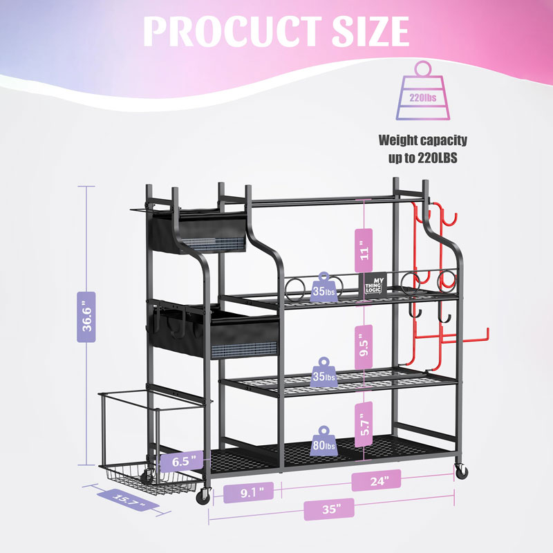 Этот стеллаж для хранения является обновленной версией, которая оснащена не только 3 слоями металлической сетки, боковой корзиной, 3-секционным железным держателем для различных тренажеров и оборудования для упражнений, но и дополнительной вешалкой из оксфордской ткани для полотенец для тренажерного зала.