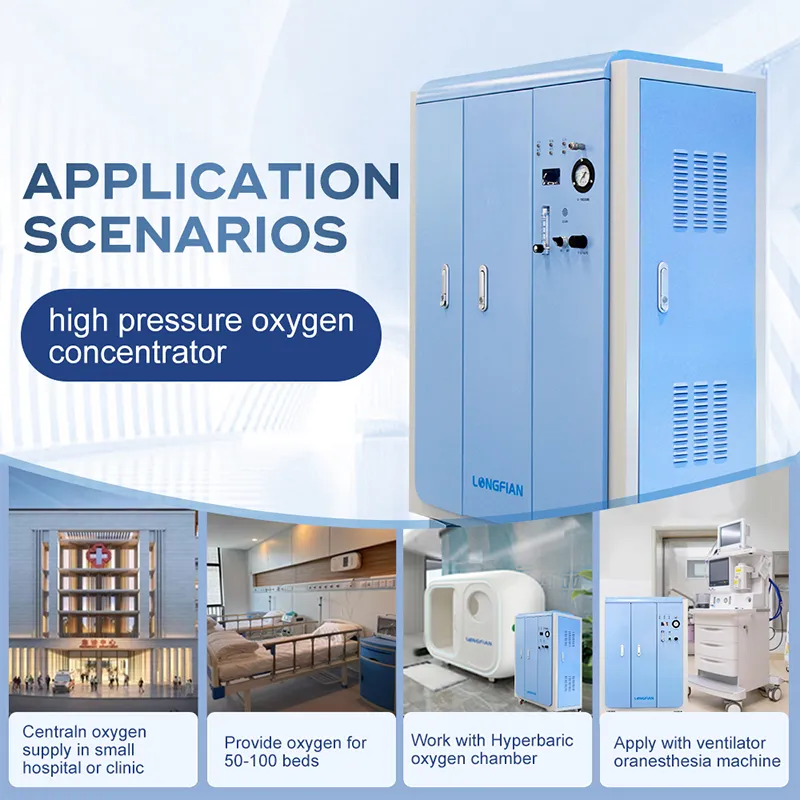 Высоконапорный кислородный концентратор Longfian производительностью 20 л/мин и давлением 4 бар/60 фунтов на квадратный дюйм отличается от обычных кислородных аппаратов. Высоконапорные кислородные концентраторы — это аппараты, выходное давление которых находится в диапазоне 0,14–0,4 МПа. Обычно они могут подключаться к аппаратам для анестезии и искусственной вентиляции легких для подачи кислорода.
