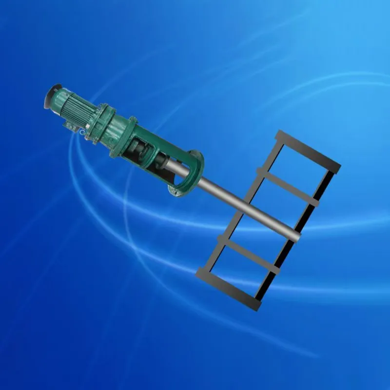 Производимые нами мешалки имеют простую конструкцию и состоят из приводного устройства, опорного подшипника, трансмиссионного вала и лопастей. В зависимости от технологических требований диаметр лопастей может варьироваться от 0,2 до 2,5 метров. Лопасти могут быть одно- или двухъярусными, при этом двухъярусные мешалки обычно оснащаются подводной опорной втулкой.