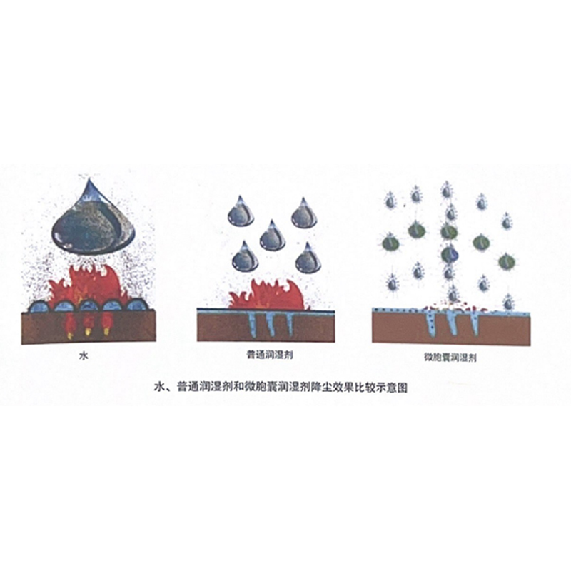 Многофункциональное микрокапсулированное средство для подавления пыли может быть добавлено в качестве смачивающего агента для смешивания с водой для тушения пожаров. В соответствии с классификацией пожаров для тушения различных типов пожаров количество добавки составляет: многофункциональные микрокапсулы пылеподавляющего агента должны составлять всего 0,25 процента от концентрации при смешивании с водой, могут использоваться для тушения пожаров класса А, 3 процента от концентрации при тушении пожаров класса В и 6 процентов от концентрации при тушении пожаров из твердых металлов категории D.
