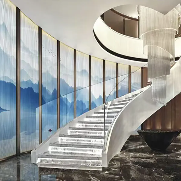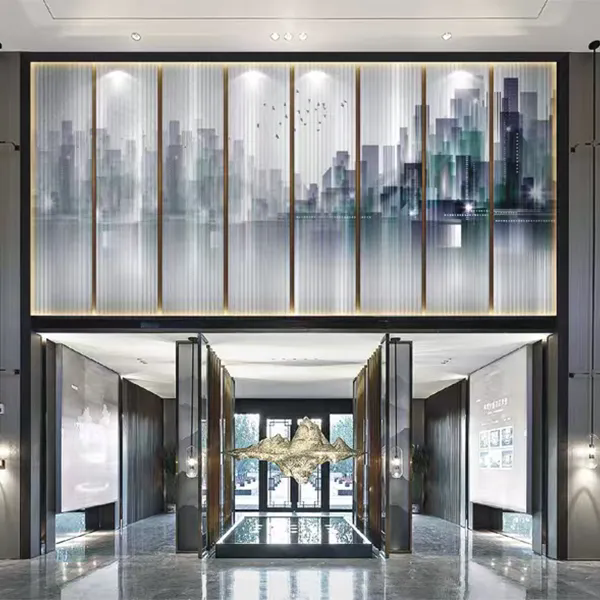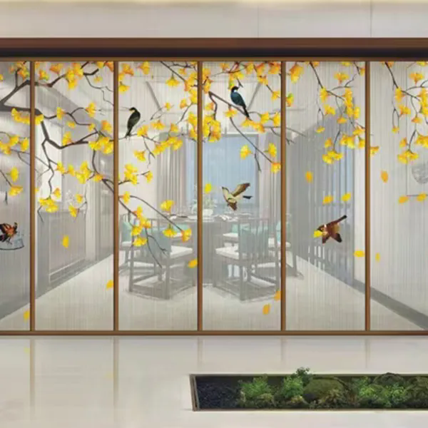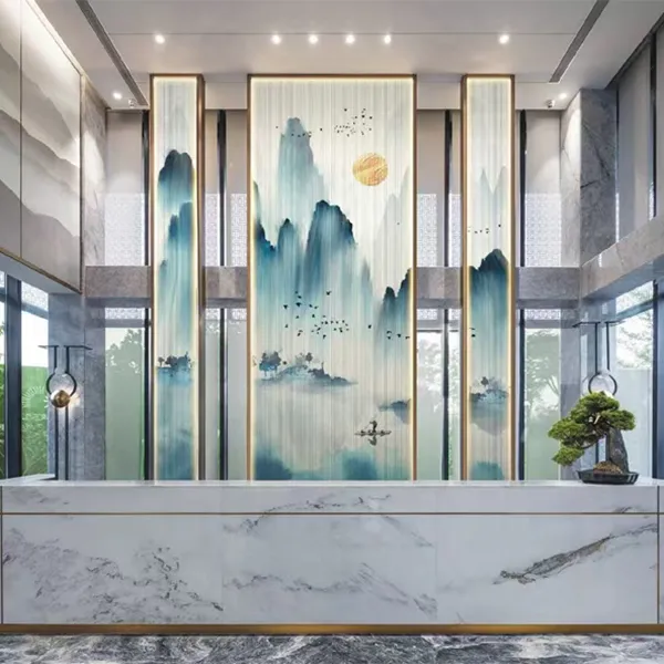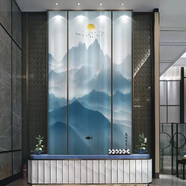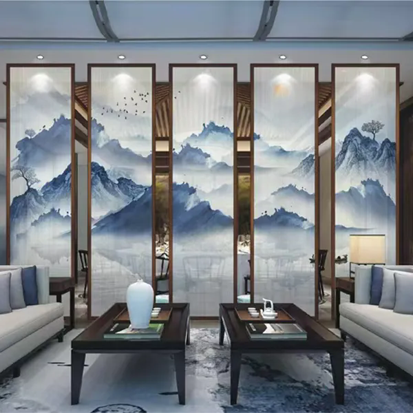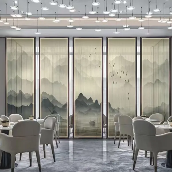 Эстетическая недосказанность восточного искусства и воздушность современного пространства сливаются здесь в совершенной гармонии. Многослойное стекло с армированной сеткой и пейзажным рисунком использует сетку как кисть, а связующую пленку — как тушь, запечатлевая бескрайний дух гор и вод внутри стекла. Это не просто перегородка, а объемная картина, которую можно осязать, — пространство, обретающее собственную поэзию в игре света и тени.