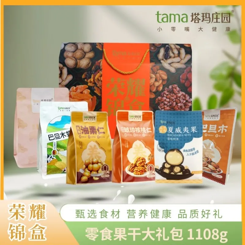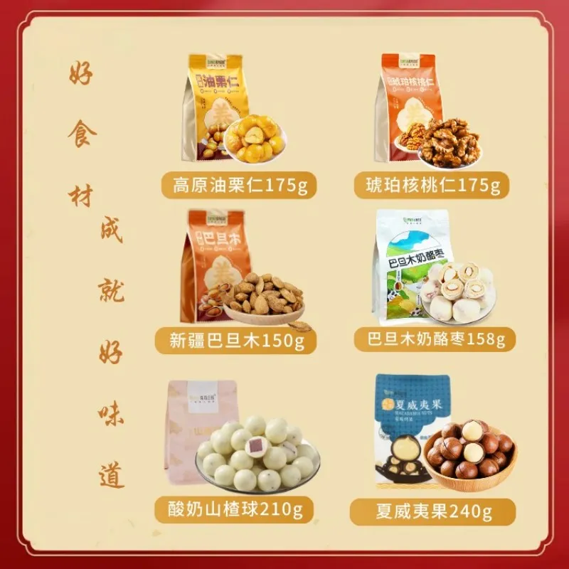 Этот набор закусок включает шесть различных вкусов, каждая из которых скрывает свою особую задумку. 240 г гавайского ореха из Линцаня, Юньнань, отобранного в солнечном регионе: ядра крупные и округлые, слегка обжаренные для сохранения натурального орехового аромата, после очистки хрустящие и нежные, идеальны для просмотра сериалов или перекуса в офисе. 175 г грецких орехов с горного плато в карамельной глазури: орехи, выращенные на солнце высокогорья, покрыты тонким слоем янтарного сахара, сладость ровная, сочетание мягкой текстуры и лёгкого жевательного эффекта создаёт гармоничный вкус. 175 г каштанов с высокогорья: тщательно отобранные каштаны медленно пропарены для сохранения свежести, очищены от скорлупы и кожицы, мякоть плотная и нежная, раскрывает натуральную сладость каштанов, удобно есть без очистки. 150 г миндаля из Синьцзяна: плоды крупные и плотные, слегка обжаренные для сохранения натурального вкуса, хрустящие с выраженным ореховым ароматом, богаты белком, полезны и сытны. 210 г йогуртовых шариков с боярышником: внешний слой — нежное йогуртовое покрытие, внутри — мягкий и сладко-кислый боярышник, баланс кислого и сладкого идеально выдержан, один шарик — настоящее удовольствие. 158 г молочных фиников: крупные красные финики в плотной молочной оболочке, с хрустящей начинкой из орехов, сочетание сладости финика, сливочности молочной оболочки и хруста орехов создаёт богатую многослойную текстуру, каждый вкус дарит уникальное наслаждение. |
