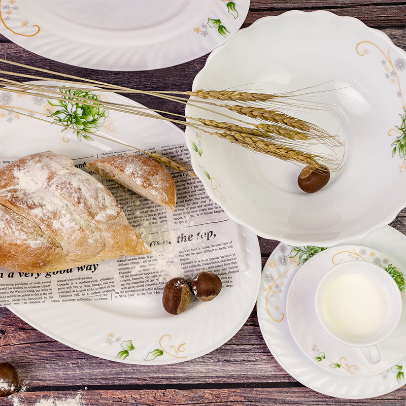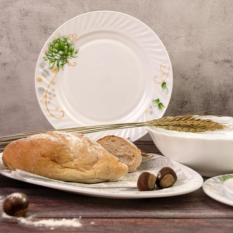 Эта посуда имеет чистый белый цвет в качестве фона, как первый зимний снег, чистый и безупречный, дает ощущение свежести и элегантности. Посуда усеяна изысканными зелеными растительными узорами, реалистичными, как будто в нее встроена полная жизненная сила, с мягкими золотыми линиями, которые добавляют немного гибкости и живости, не теряя элегантности и роскоши.