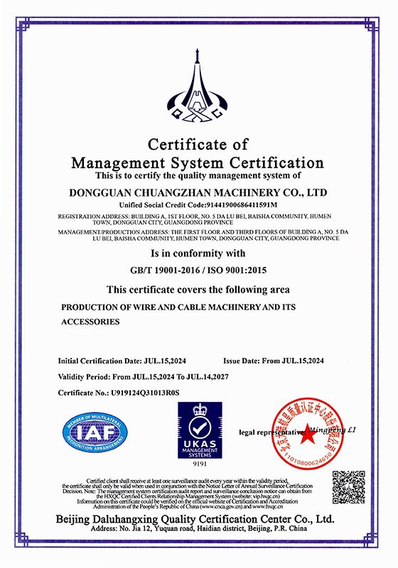 ООО «Чуанчжань Интеллектуальные Технологии» (Гуандун) является профессиональным производителем оборудования для производства проводов и кабелей. Основанная в 2003 году, компания имеет более чем 20-летнюю историю. В Дунгуане, Хуэйчжоу и провинции Хубэй расположены три производственные базы общей площадью 86 000 м², на которых работает более 260 сотрудников. Компания «Чуанчжань» стремится предоставить клиентам автоматизацию, инновационные технологии, интеллектуальное кабельное оборудование, чтобы клиенты могли достичь более стабильного качества, более эффективных производственных мощностей и снижения себестоимости.