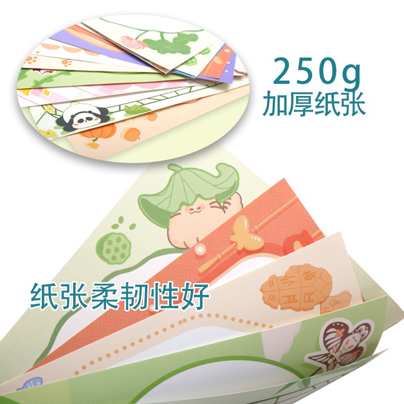 Этот новый картон в китайском стиле включает 10 оригинальных дизайнов, включающих такие элементы, как панды, традиционные узоры и традиционные китайские девушки, что отражает богатую восточную эстетику. Изготовленный из утолщённой бумаги плотностью 250 г, он прочный и совместим с различными творческими инструментами, включая маркеры, цветные карандаши и акварель. Он удобен в использовании, будь то ведение дневника, рисование или традиционное китайское творчество.