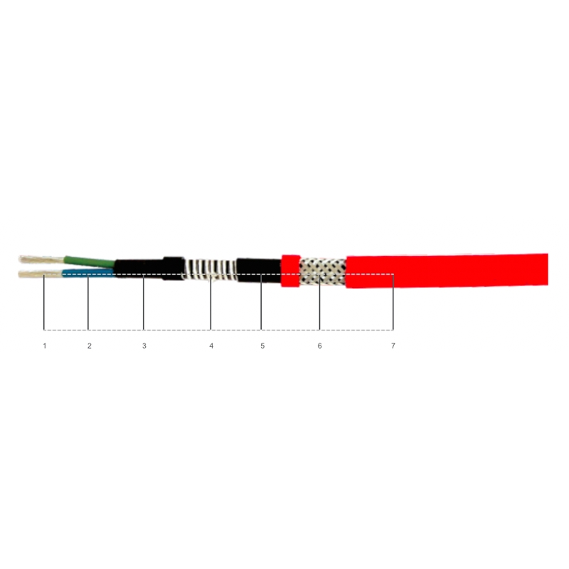 1/лудительная медная шина 2/изоляция источника питания 3/изоляция внутренней оболочки 4/хромель-хромель-нагревательный элемент 5/изоляция внешней оболочки 6/плетная оболочка 7/фторопластовая оболочка вне ткачества обеспечивает дополнительную защиту для электрообогрева и ткачества трубопроводов, подвергающихся воздействию химических веществ или коррозии и подземной прокладке.