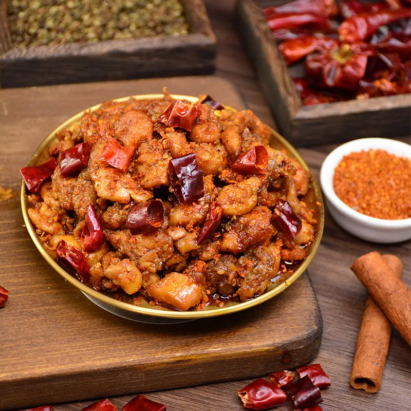Используя только задние лапки, которые умеренно активны, их вручную нарезают на равные кусочки и промывают проточной водой от загрязнений. В рецепте острого маринада, хранящегося в секрете уже много веков, основными ингредиентами являются перец Ханьюань-сычуань и перец Гуйчжоу-чаотянь, а также такие секретные специи, как цаоко (яблоко) и гвоздика. Сначала обжарьте до появления аромата, чтобы получился красный маринад на масле. Затем нарезанного кубиками кролика медленно маринуют на медленном огне до загустения соуса. Одурманивающий аромат сычуаньского перца и острый, жгучий вкус перца чили переплетаются, пропитывая каждую клеточку крольчатины, создавая многослойный, пряный вкус. Первый глоток — это покалывание от сычуаньского перца, за которым следует мягкий жгучий вкус перца чили. Послевкусие покалывает от естественной сладости мяса, создавая пряный, но не резкий вкус, который усиливается с каждым разом.